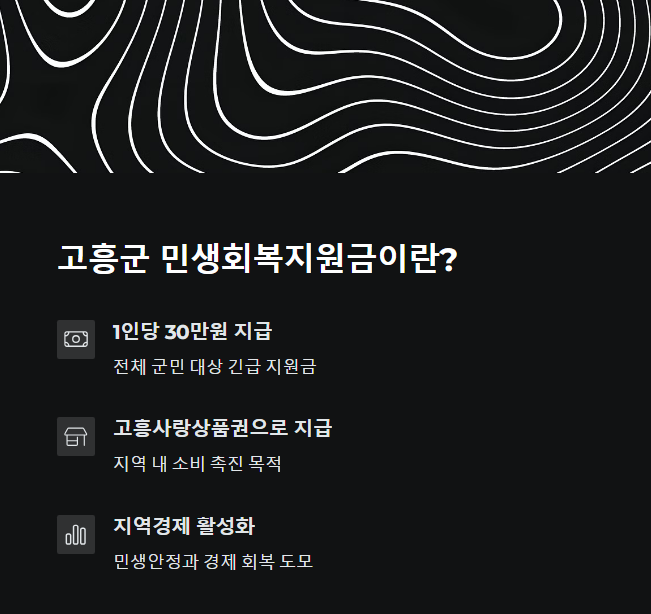 고흥군이 지역 경제 활성화와 주민들의 민생안정을 위해 전체 군민을 대상으로 지급하는 긴급 지원금이에요.