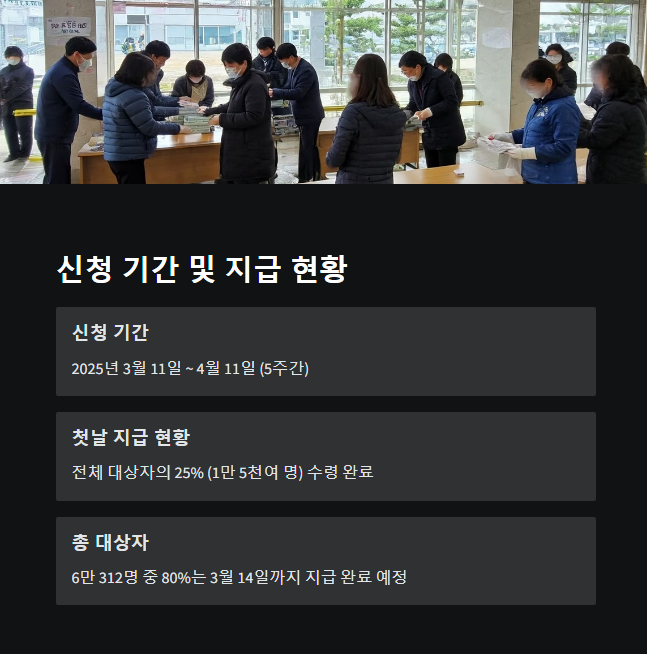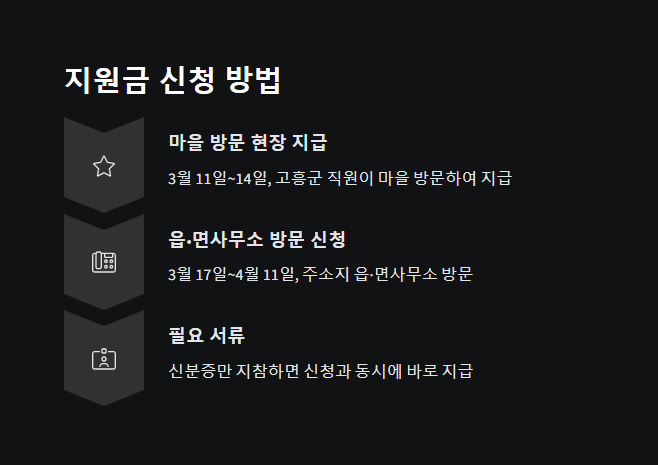 고흥군은 마을 방문 현장 지급 방식을 적극 활용해 3월 14일까지 전체 대상자의 80% 이상에게 지급을 완료할 계획이라고 하네요.