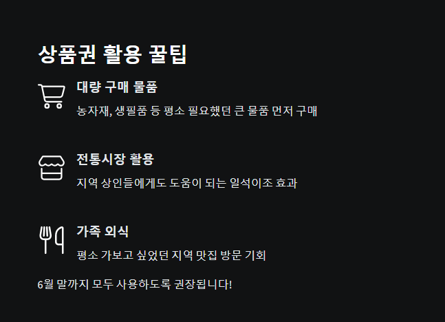 특히 농사를 짓는 분들은 농자재 구매에, 가족이 있는 가정은 외식이나 생필품 구매에 요긴하게 사용할 수 있을 것 같아요.