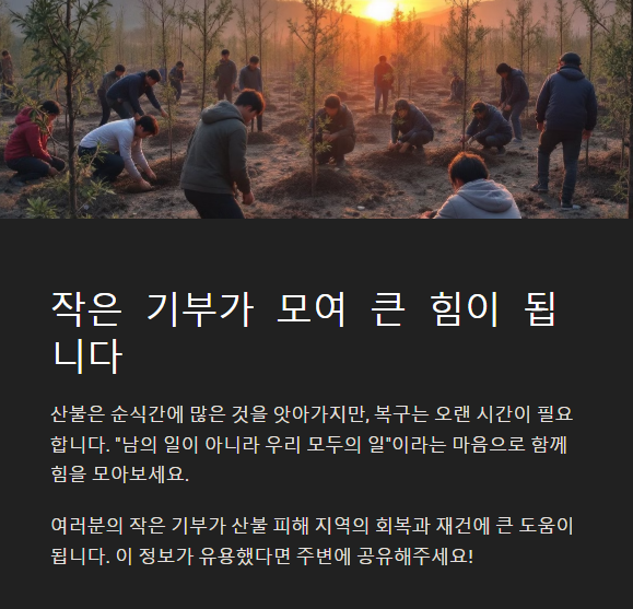 여러분의 작은 기부가 모여 산불 피해 지역의 회복과 재건에 큰 힘이 될 거예요. 💪