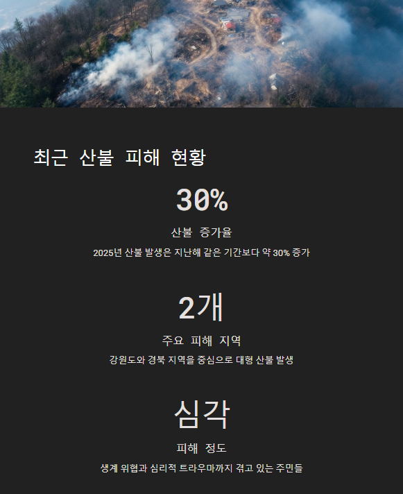 산림청 자료에 따르면, 2025년 들어 전국적으로 발생한 산불은 지난해 같은 기간보다 약 30% 증가했다고 해요. 😱