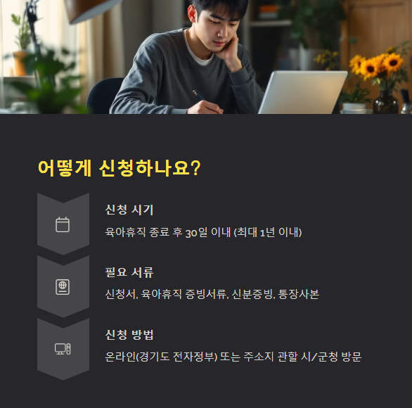 - 육아휴직 종료 후 30일 이내 신청 권장 (최대 1년 이내)